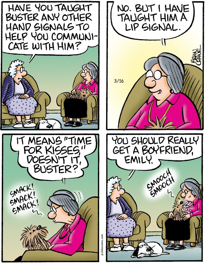 Pickle comics featured the grandparents, Earl and Opal who are in their 70s and retired, they also have a grandson named Nelson Wolfe who is a year old, whose life is spoiled by his grandparent which every grandparent do with their grandson, they also have cat name muffin. These comic strips are full of humor for old age people.